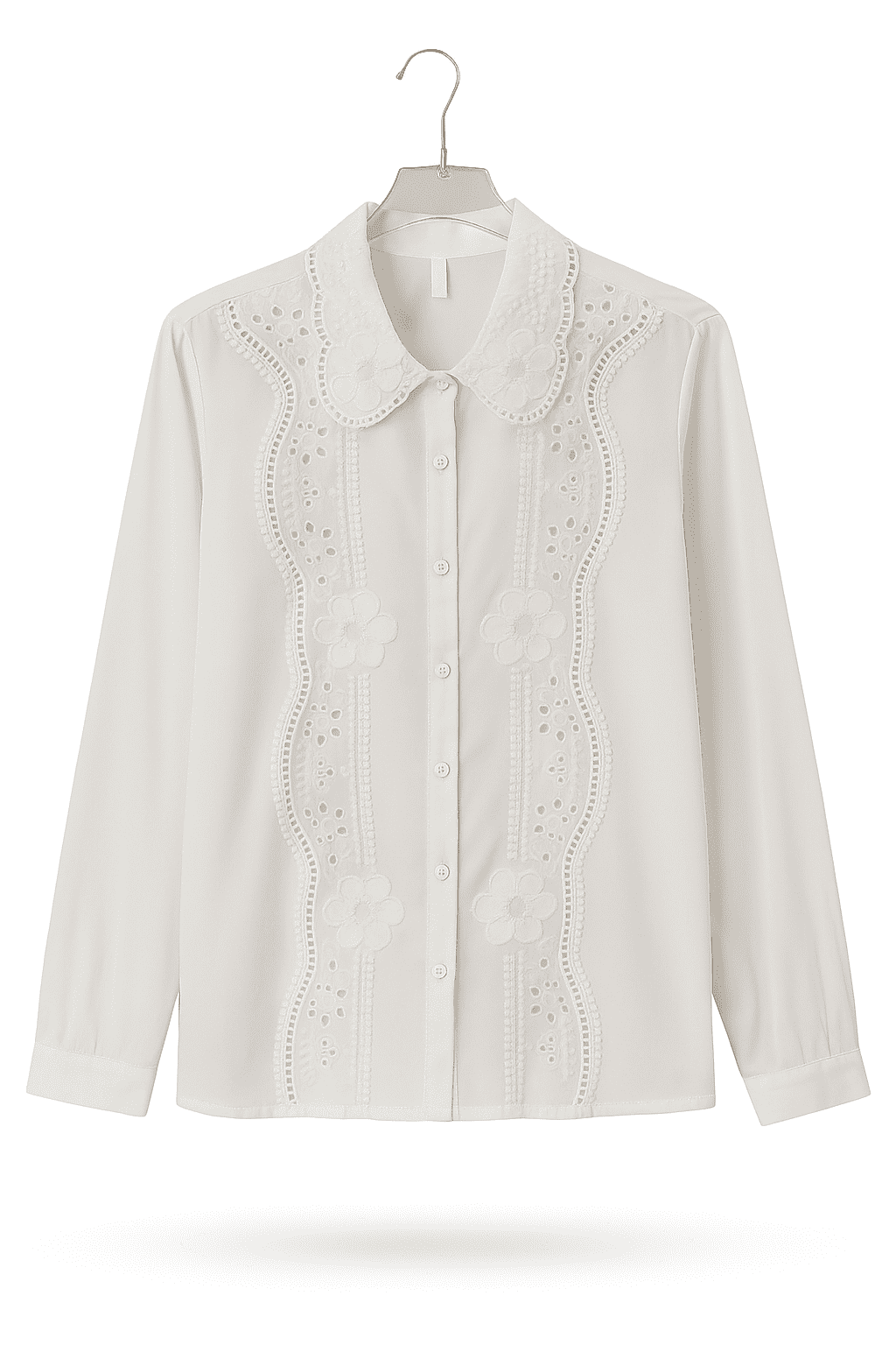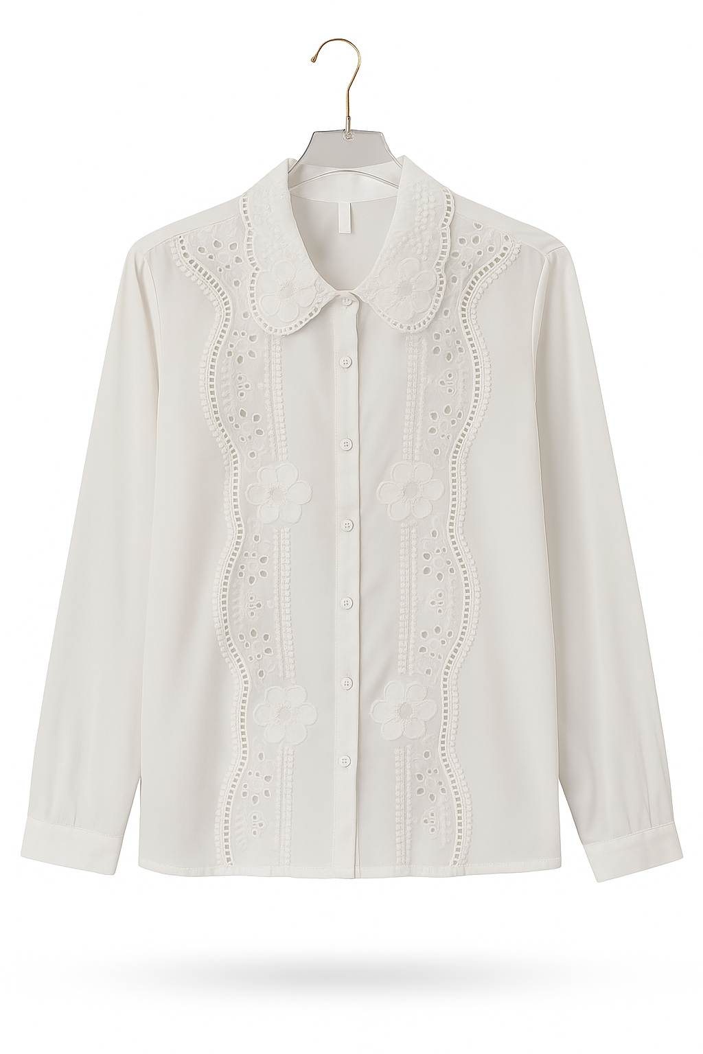 This is a Full-sleeve shirt featuring delicate floral lace detailing along the collar and button placket, buttoned cuffs, and a lightweight, airy fabric for an elegant and feminine look