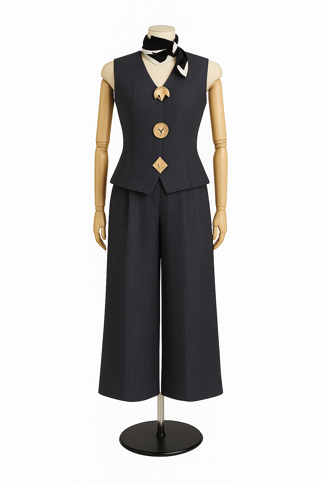 A sleek semi-formal pantsuit featuring a sleeveless tailored vest with oversized statement buttons and wide-leg trousers. Paired with a chic monochrome scarf, this set exudes modern elegance with a bold fashion edge.