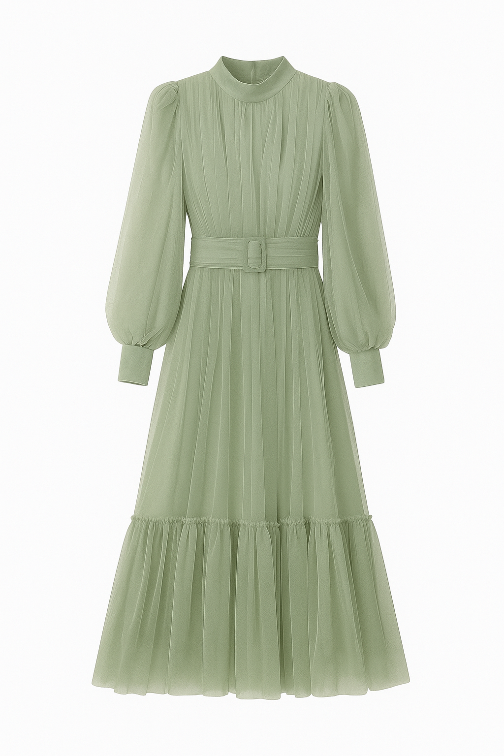 A sophisticated sage midi dress featuring delicate pleats, long puff sleeves, and a matching belted waist. Designed with a high neckline and a tiered hem, this dress combines timeless elegance with modern charm, perfect for formal gatherings or special occasions.