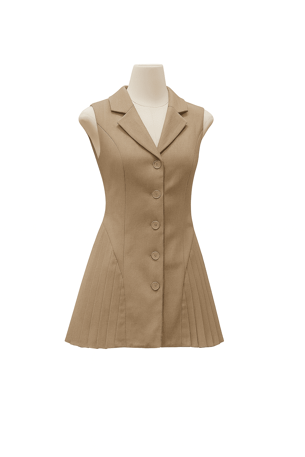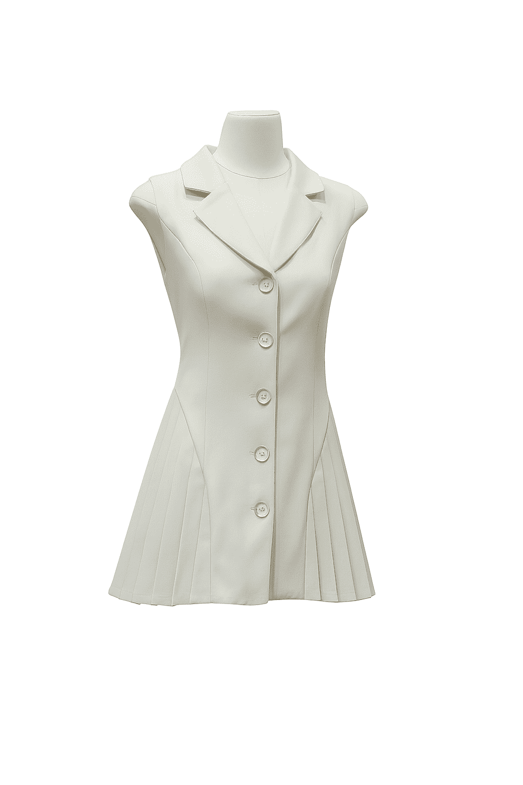 A tailored sleeveless dress featuring a sharp notched lapel, button-down front, and structured pleated panels at the hem. Designed with clean lines and a fitted silhouette for a polished and modern look.